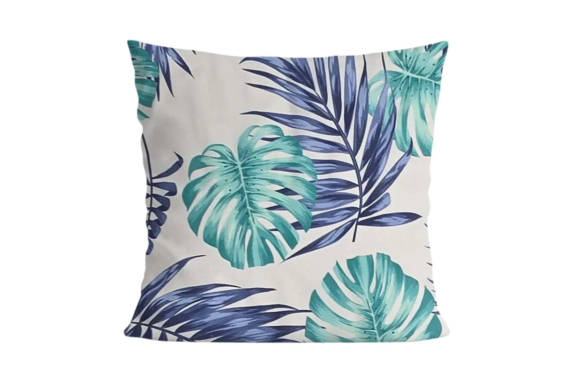 • Design tropical modern și vibrant: Imprimeu luxuriant de frunze albastre și verzi pe fundal alb.