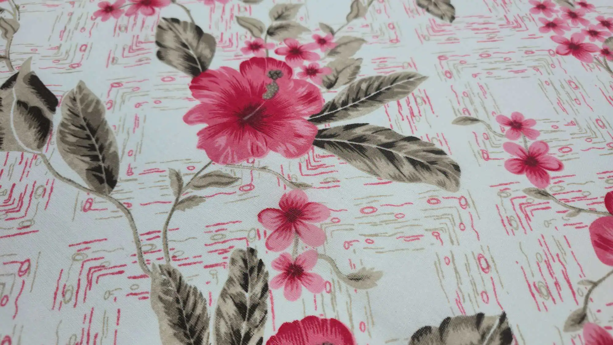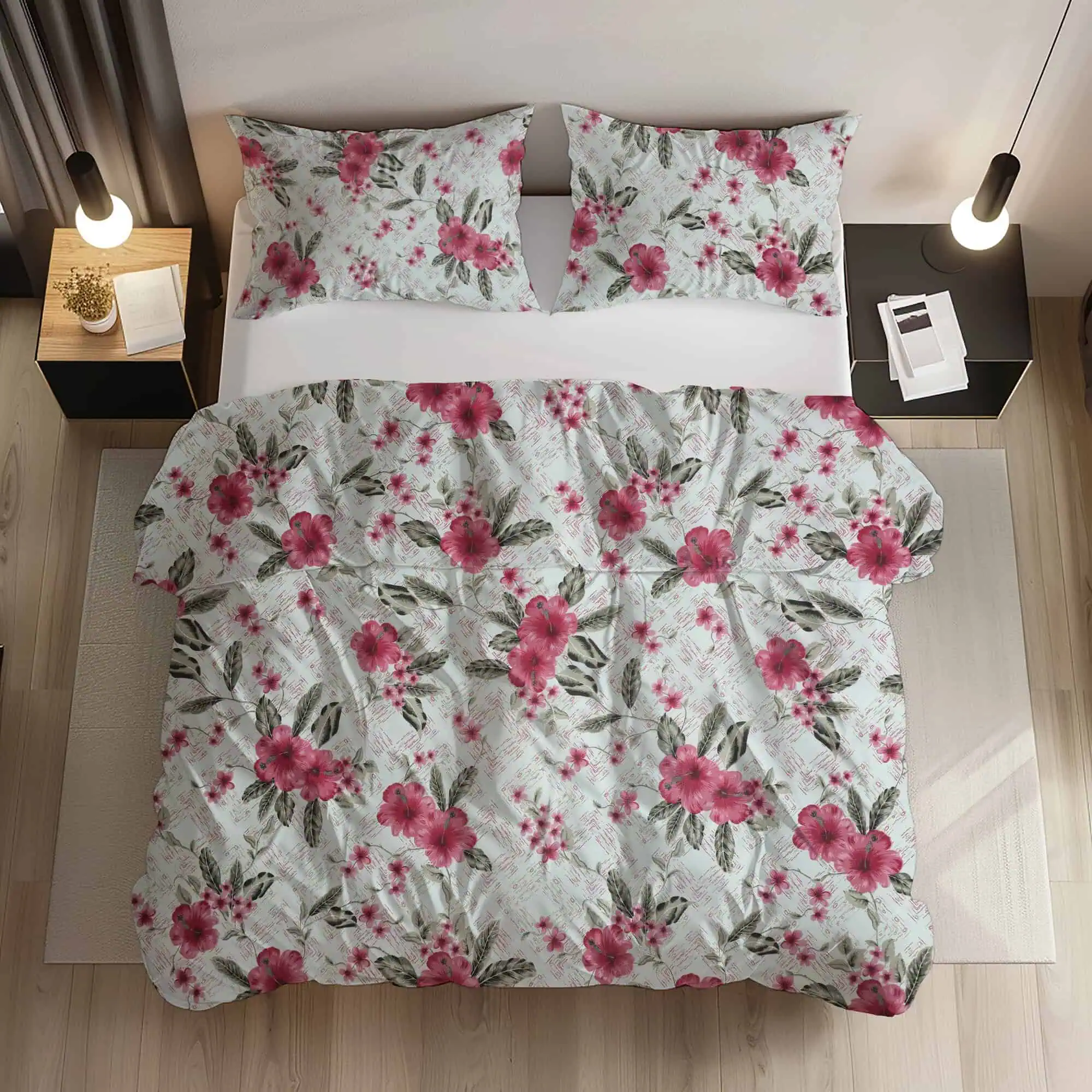 Adu prospețimea unei vacanțe tropicale direct la tine acasă cu modelul Tropical Hibiscus. Acest design captivant prezintă flori mari de hibiscus în nuanțe vibrante de roz și roșu, așezate pe un fundal deschis cu o textură geometrică discretă. Este alegerea ideală pentru a adăuga culoare, vitalitate și un aer romantic dormitorului tău, transformându-l într-un spațiu plin de energie pozitivă.
