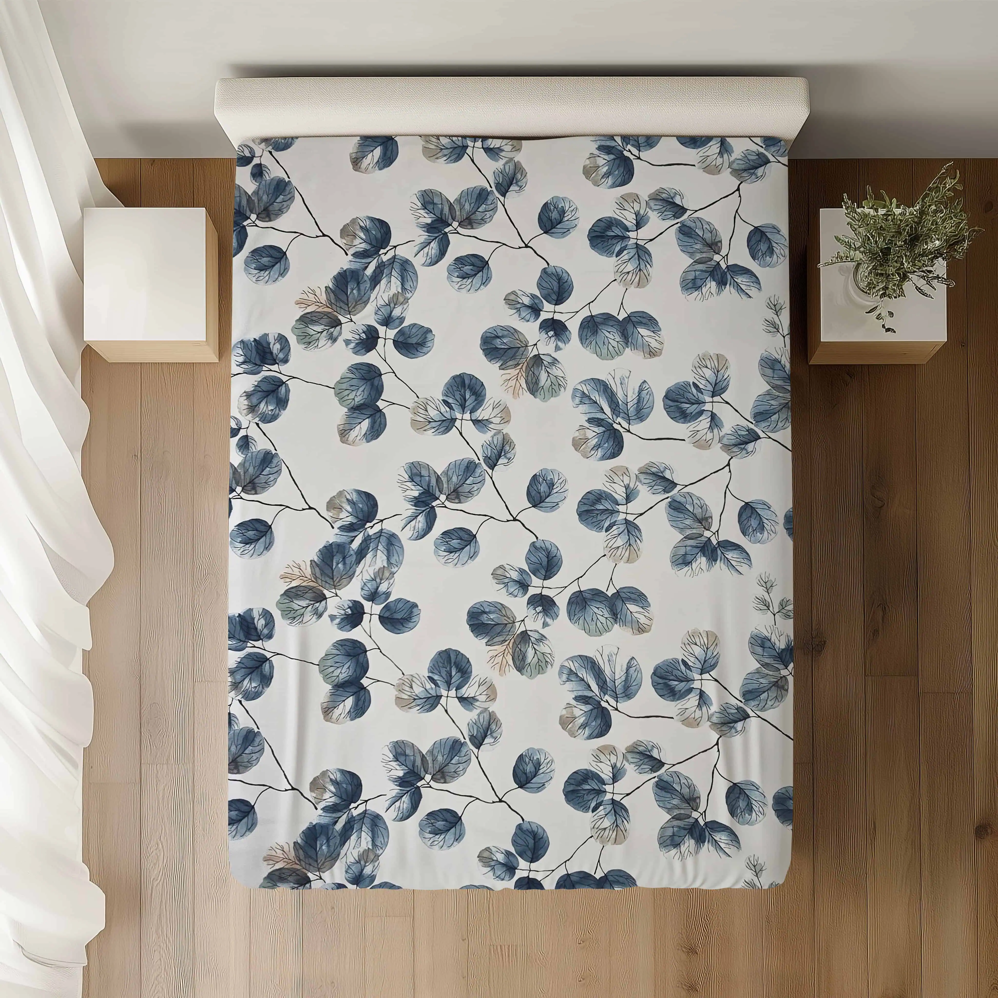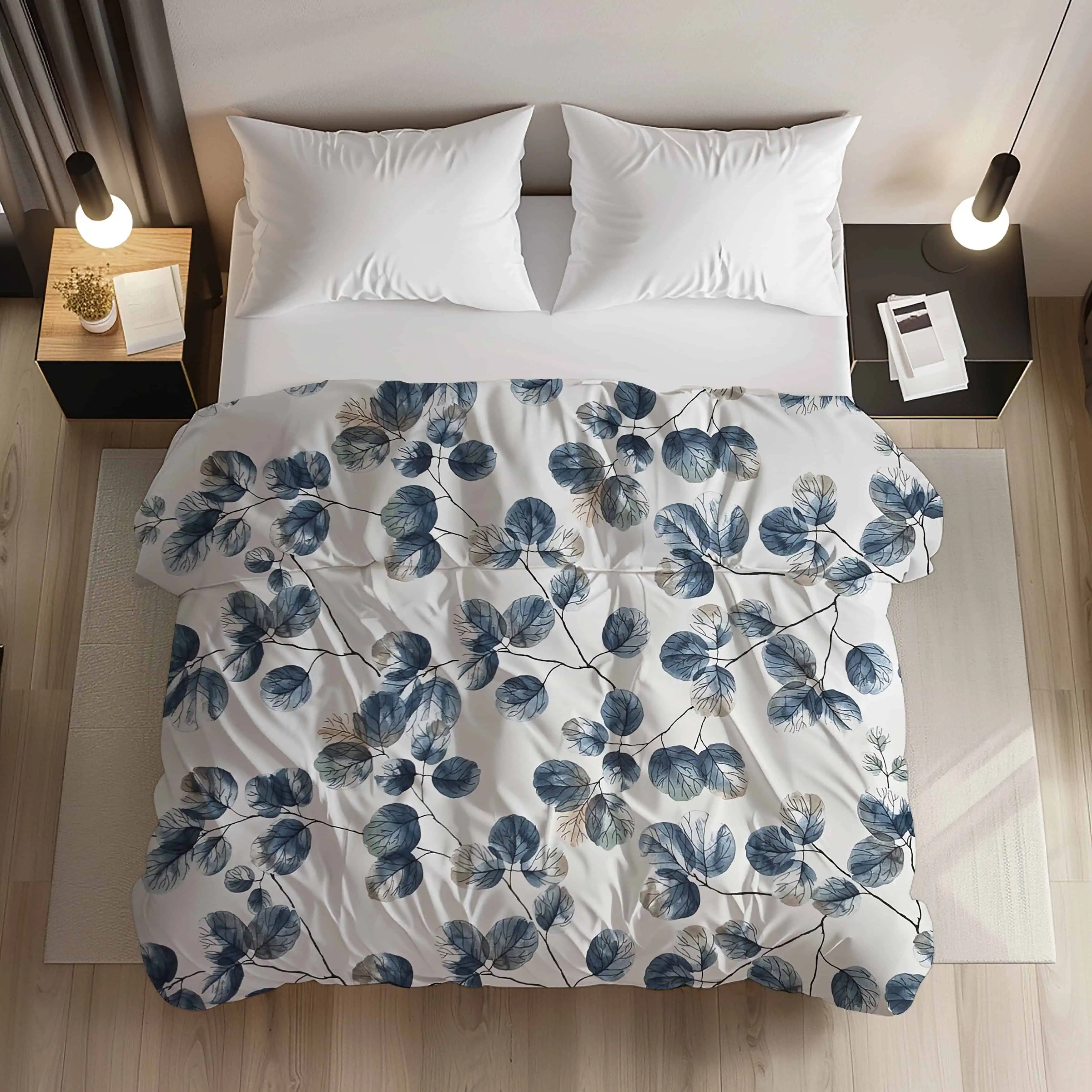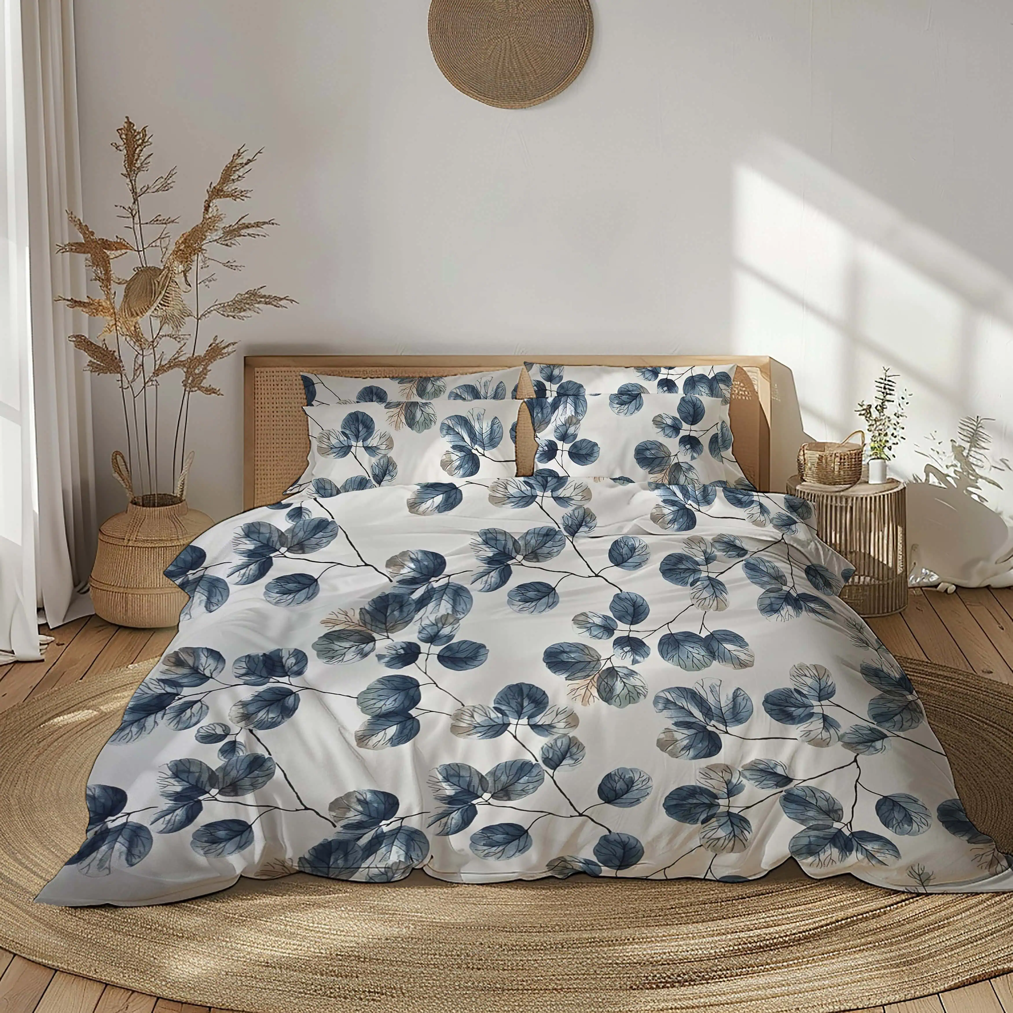 Designul lenjeriei este caracterizat de un model delicat cu frunze de eucalyptus în nuanțe de albastru, gri și bej, dispuse armonios pe un fundal alb luminos. Această paletă de culori subtilă, dar elegantă, creează o atmosferă calmă și relaxantă, ideală pentru a te deconecta la finalul zilei. Indiferent dacă îți amenajezi un dormitor boem sau unul minimalist, acest set de lenjerie cu model vegetal va fi piesa de rezistență.
