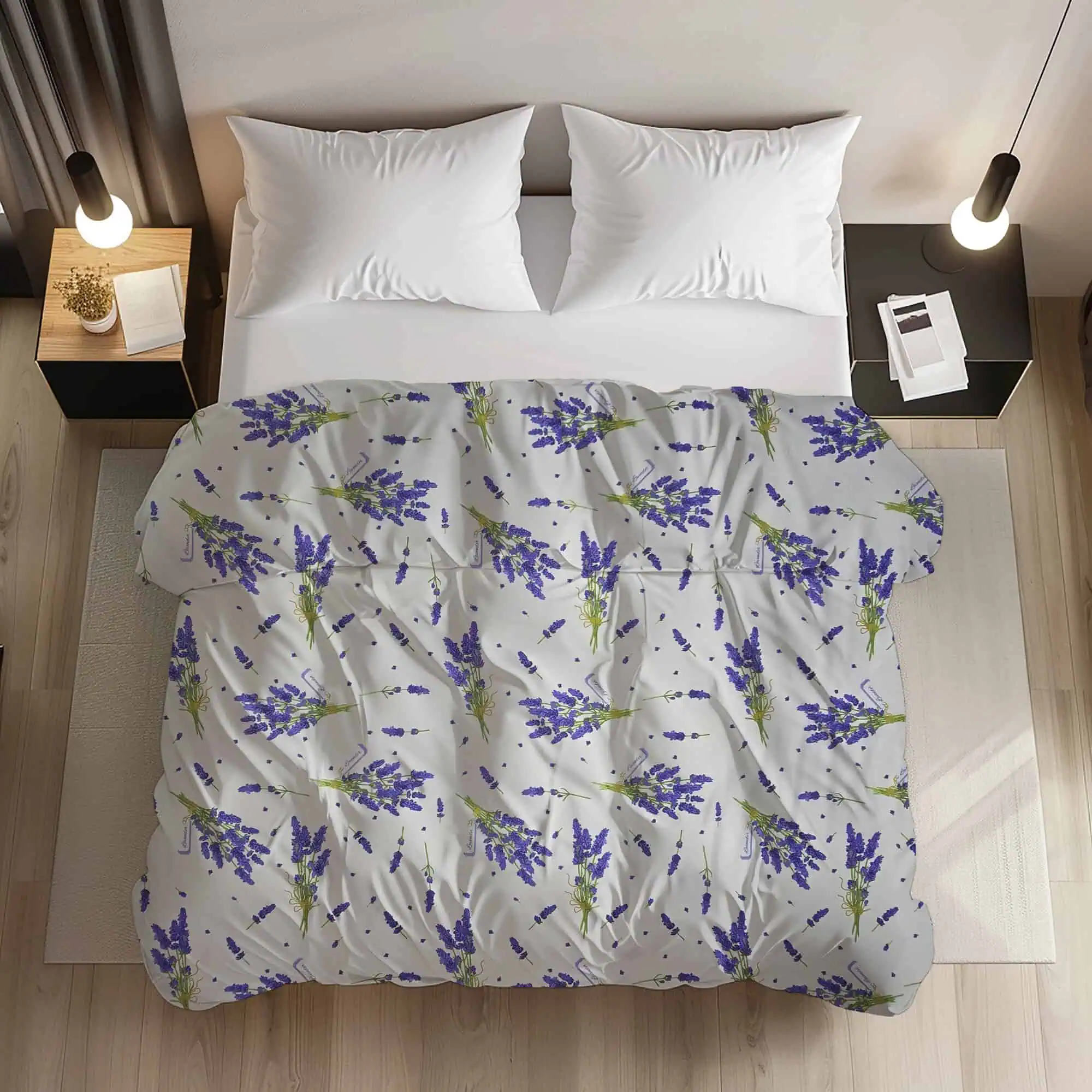 Transformă-ți dormitorul într-o oază de relaxare cu acest set de lenjerie de pat lavandă din polibumbac, configurabil după preferințele tale! Explorează și celelalte modele naturale și liniștitoare din colecția noastră de lenjerie de pat.