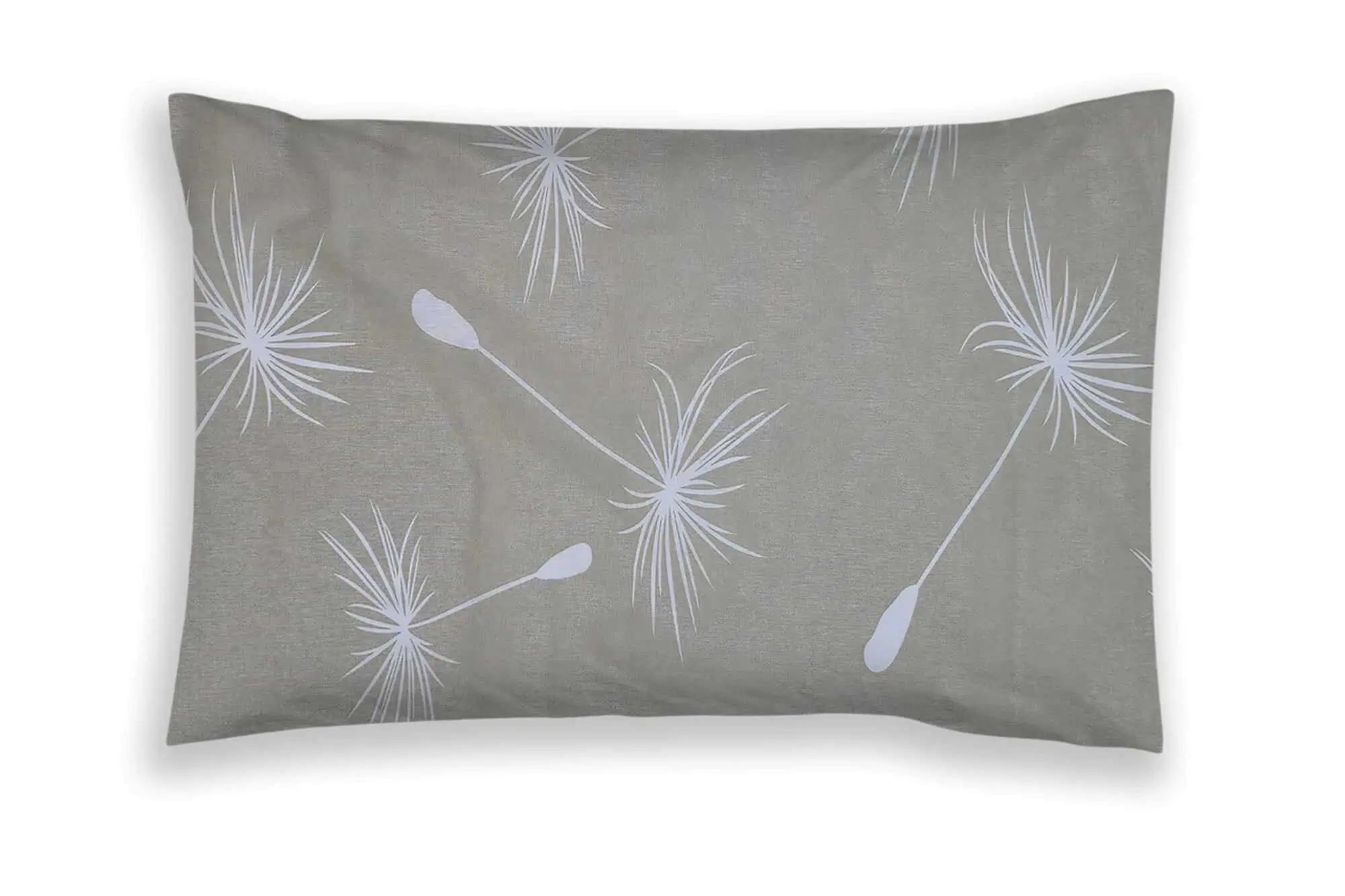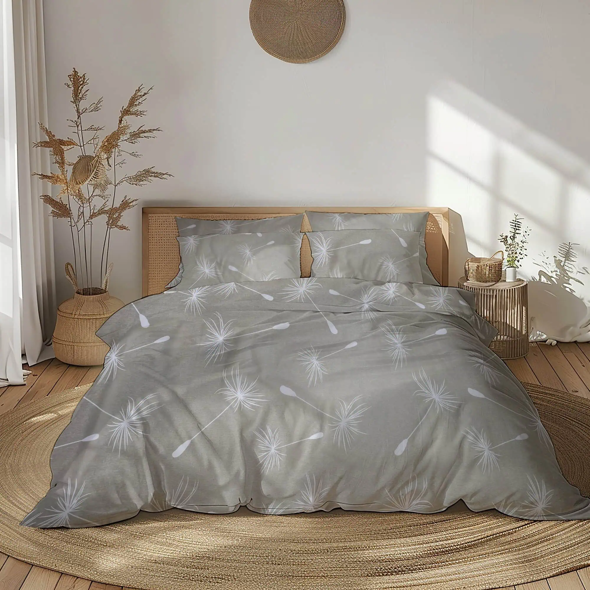 Designul minimalist, cu imprimeu de puf de păpădie în alb pe un fundal neutru bej-grej, adaugă o notă de calm și modernitate subtilă dormitorului. Paleta de culori neutre permite integrarea ușoară a lenjeriei în orice stil de decor, de la cel scandinav la cel modern.